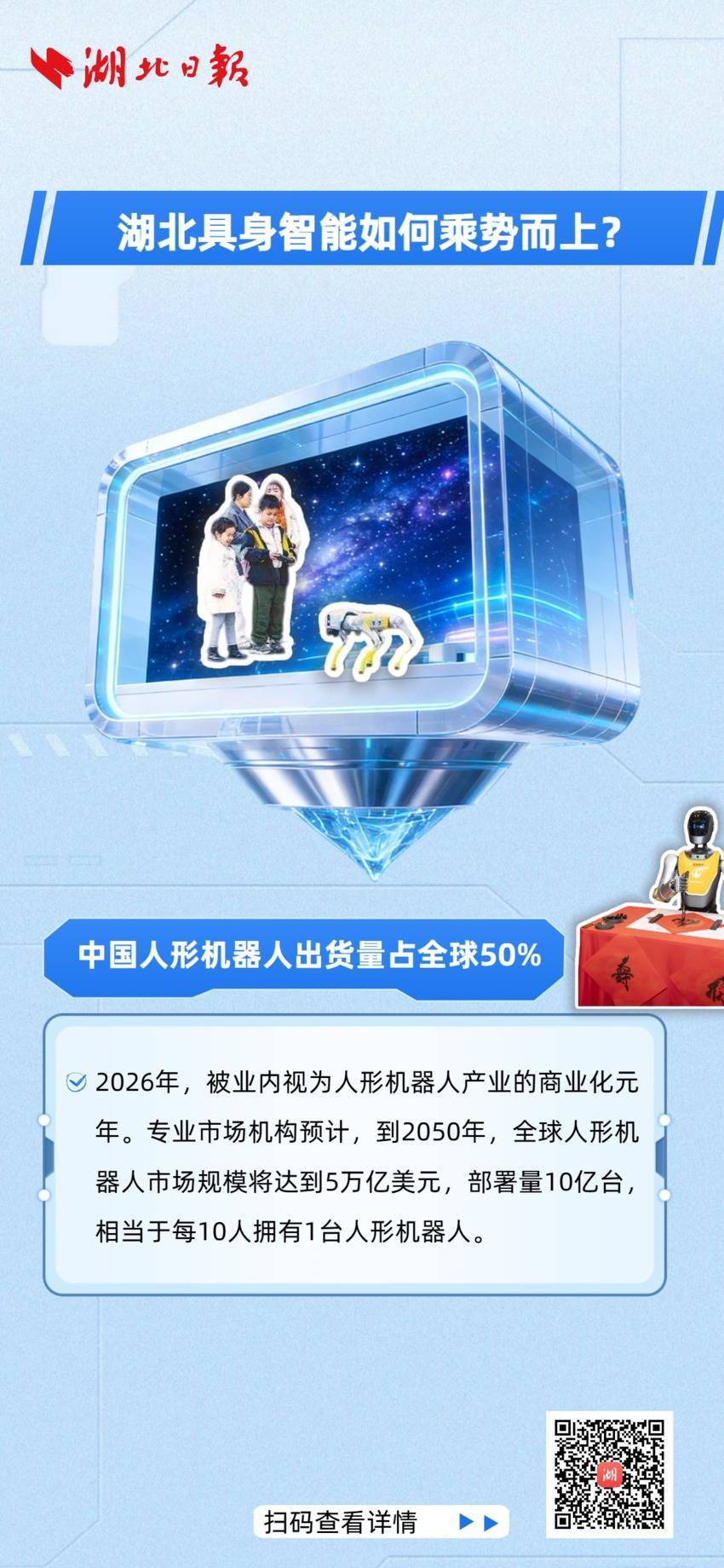 2026年,被业内视为人形机器人产业的商业化元年。专业市场机构预计,到2050年,全球人形机器人市场规模将达到5万亿美元,部署量10亿台,相当于每10人拥有1台人形机器人。